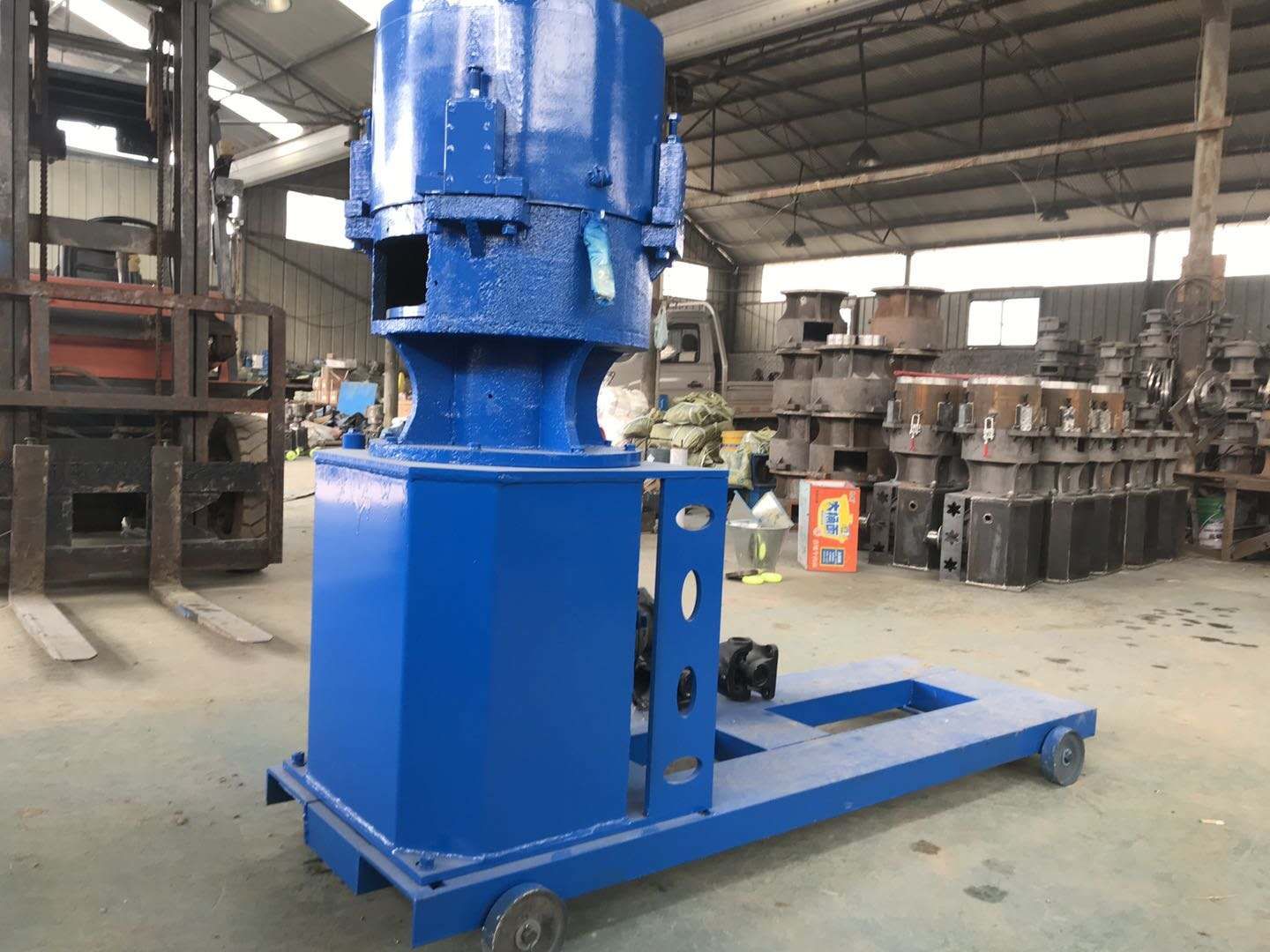 1.机身为一独立长方体、由轴承架、减速箱、机座三大件组成。加料粉斗与轴承架连接,伸向机外,机座前端设计为伸出、着地广而平稳,因此不须安装、可任意放置室内使用。鸡鸭鹅牛羊兔饲料颗粒机塑料颗粒生产好机器